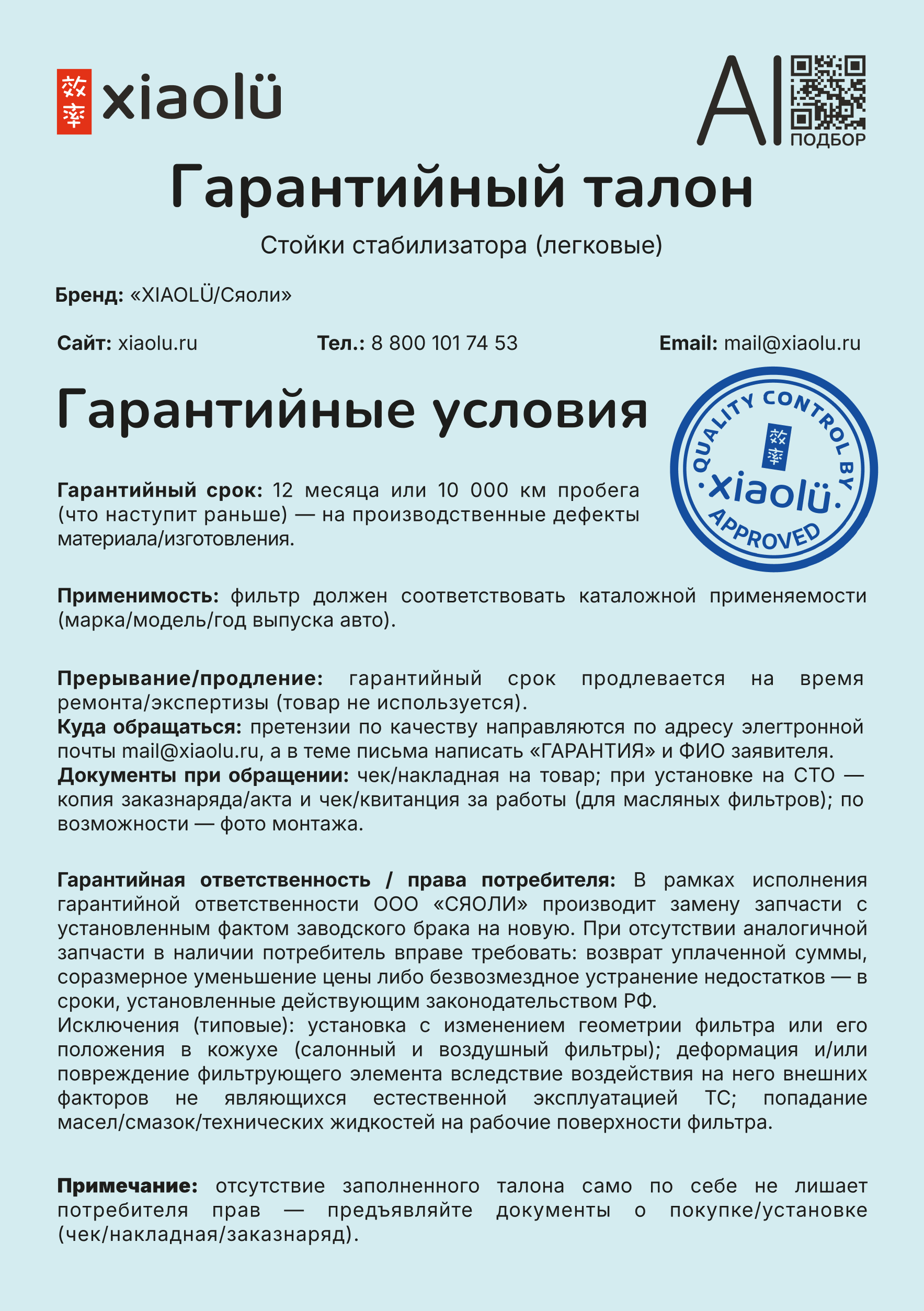 Безусловная гарантия на каждую деталь и расходный элемент.